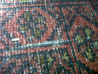 You can see the white pupa casing on the back of this oriental rug. This site had clothes moths, and of 8 oriental rugs, 6 had readily visible evidence of activity. These photos are all from the rear of the rugs or the floors beneath them. The next photo is the hardwood floor and the grainy frass left by the larval stage feeding on the rug.